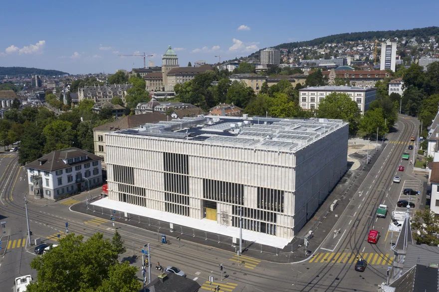 An Stelle des ehemaligen Wolfbachweihers, der beiden Turnhallen und des Turnplatzes der Alten Kantonsschule errichtete David Chipperfield (* 1953) 2016-21 einen mächtigen Kubus von mehr als 60 m Kantenlänge und 21 m Höhe, der einerseits die Sicht auf die Alte Kantonsschule auf der Schanze verstellt, andererseits den Heimplatz zum Kulturforum umgestaltet. Bereits 1934 hatte Karl Moser den Platz für einen Ausstellungsbau vorgeschlagen. Vier Jahre später propagierte Hans Hofmann, der Chefarchitekt der Landesausstellung 1939, im Zusammenhang mit der Planung des „Bührle-Baus“ die Idee einer „Kunstinsel“ am Heimplatz, der geschlossen umbaut und für Fussgänger reserviert werden sollte. In den 1960er Jahren ortete der Architekt und Publizist Alfred Roth hier „das eigentliche kulturelle Zentrum der Stadt“, das mit dem 1964 prämierten Projekt für den Schauspielhausneubau von Jörn Utzon (1918-2008), dem Erbauer der Oper in Sidney, vollendet werden sollte. Utzon schlug einen grossflächigen, sich von der Alten Kantonsschule bis in den Heimplatz hinein ersteckenden Baukörper vor. Die auf den verkehrsbefreiten Platz zuführenden Verkehrsachsen sollten als Teil des geplanten City-Rings massiv verbreitert und teilweise in den Untergrund verlegt werden. Trotz vehementer Unterstützung durch Sigfried Giedion, den Promotor des Neuen Bauens, wurde das mit umfangreichen Abbrüchen und Strassenbauten verbundene auf 86 Millionen Franken veranschlagte Projekt 1970 aufgegebenen.