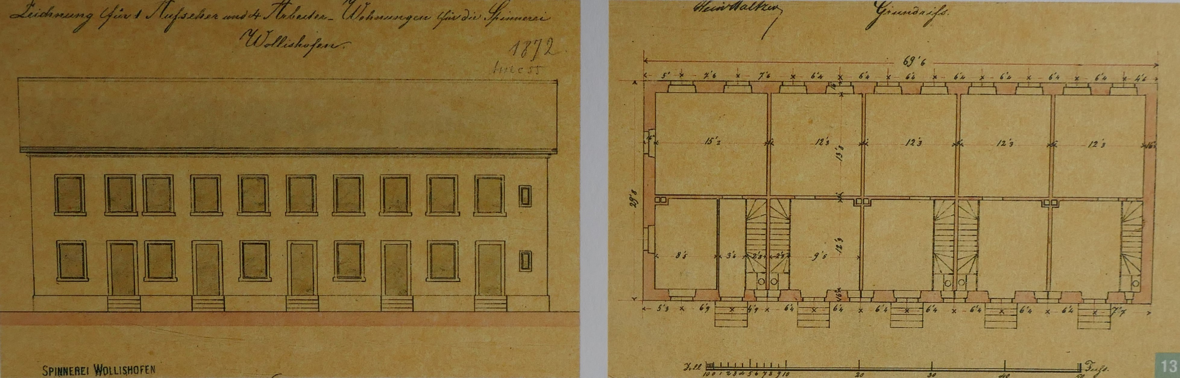 In den Hinterhäusern befanden sich die Wohnungen für die Dienstboten – ebenfalls ein Novum im städtischen Umfeld und Zeichen eines erwachenden sozialen Bewusstseins. Die dreiteilige, schlichte Häuserzeile mit Satteldach orientiert sich sowohl in der äusseren Gestalt als auch im Grundriss der für damalige Verhältnisse grosszügig dimensionierten Etagenwohnungen an den Kosthäusern der ländlichen Industriebetriebe des frühen 19. Jahrhunderts. O.C.