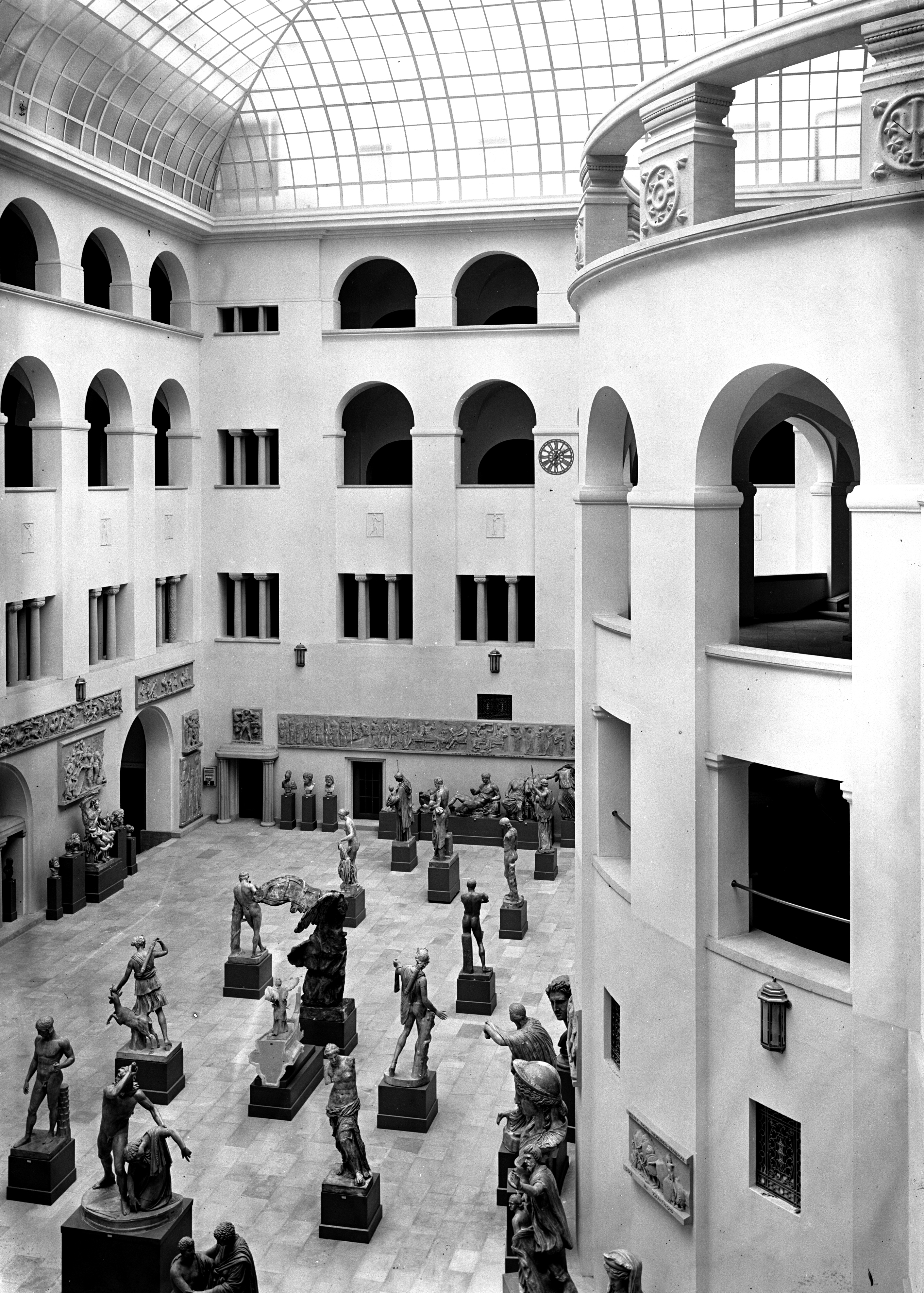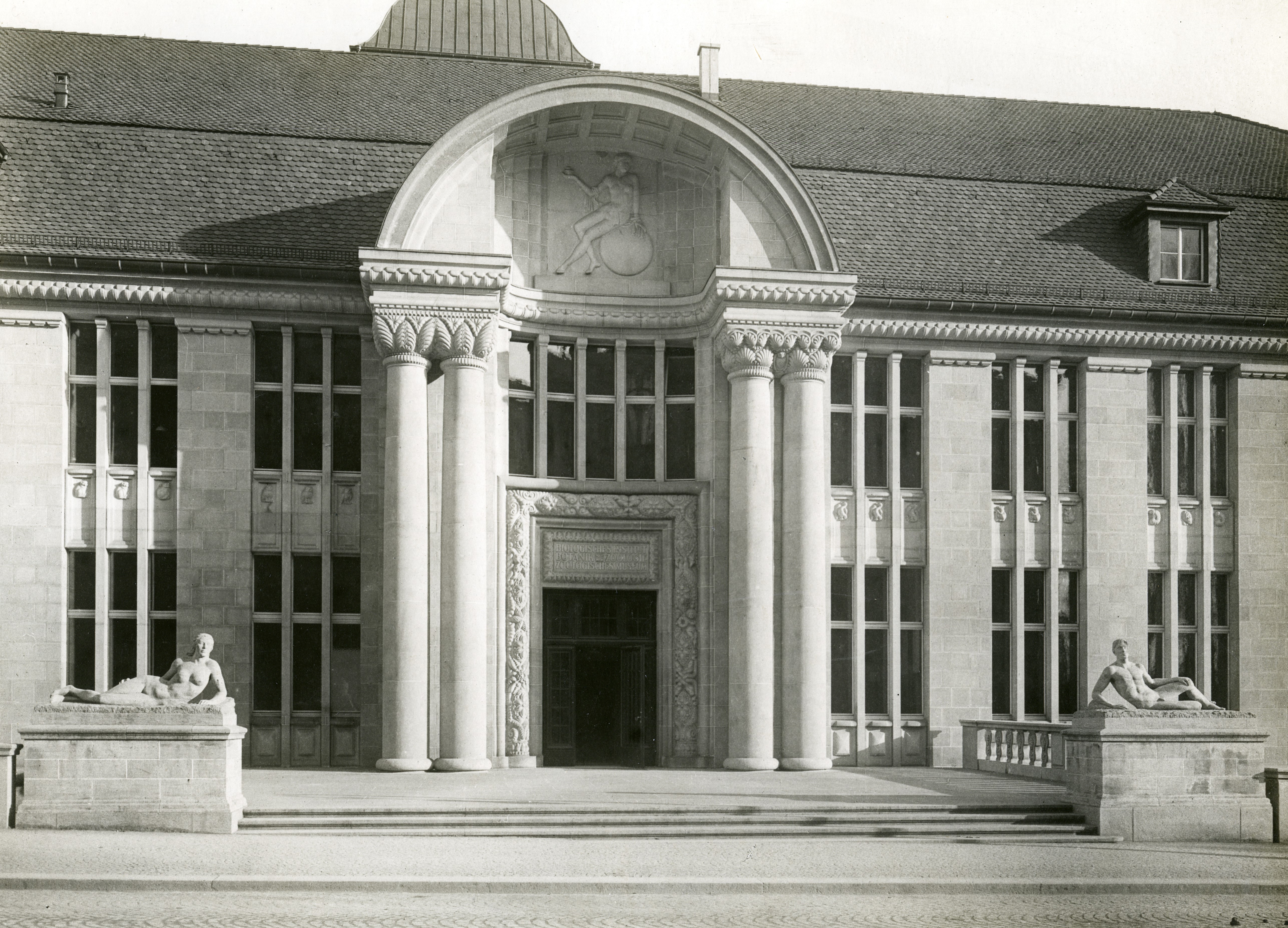 Gartenterrasse, Bassins und Baumreihen, dazwischen die mit Treppen und Skulpturen dramatisch inszenierten Zugänge zu den plastisch kräftig gegliederten Haupteingängen, rahmen den Gebäudekomplex, dessen stark durchfensterte, über der Sockelzone von pilasterartig ausgebildeten Pfeilern gegliederte Fassaden mit darüberliegenden Mansardenwalmdächern der barocken Schlossarchitektur verpflichtet sind.