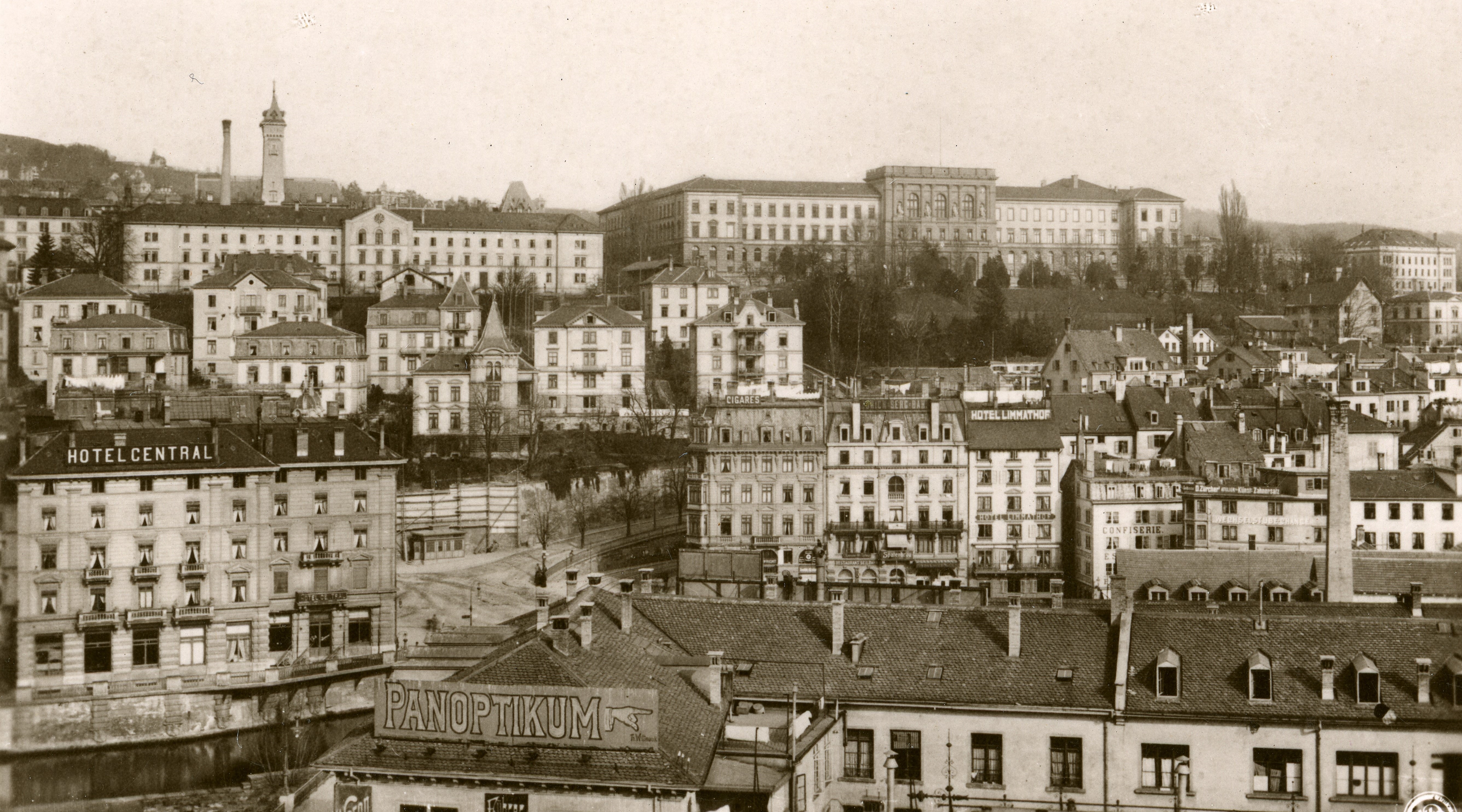 Im Bestreben, das für eine erfolgreiche Industrialisierung der Schweiz erforderliche technische Personal und Wissen unabhängig vom Ausland auszubilden und zu entwickeln, beschlossen die eidgenössischen Räte 1854 die Gründung des Eidgenössischen Polytechnikums (seit 1905 ETH) in Zürich nach dem Vorbild der Pariser Ecole Polytechnique (1794/1804). Da nach der Niederschlagung der Revolution von 1848 zahlreiche namhafte Gelehrte und Wissenschaftler Deutschland verlassen mussten und bereit waren, in der liberalen Schweiz am Aufbau der neuen Hochschule mitzuwirken, gewann diese rasch einen guten Ruf und war ihrer Aufgabe, eine konkurrenzfähige technische Elite auszubilden, gewachsen. So nahm auch Gottfried Semper, der sich als Architekt in Dresden bereits einen Namen gemacht hatte, die ihm angebotene Professur 1854 an. Kurz darauf erhielt er den Auftrag, ein Projekt für das Schulgebäude von Polytechnikum und Universität auf dem ehemaligen Schanzengelände gegenüber dem neuen Kantonsspital auszuarbeiten. 1859-64 wurde der funktional gegliederte, über der Stadt thronende Neurenaissance-Bau mit vorgelagerter Terrasse und selbständigem Chemiegebäude an der Rämistrasse nach Sempers Plänen von Staatsbaumeister Johann Caspar Wolff (1818-91) realisiert.