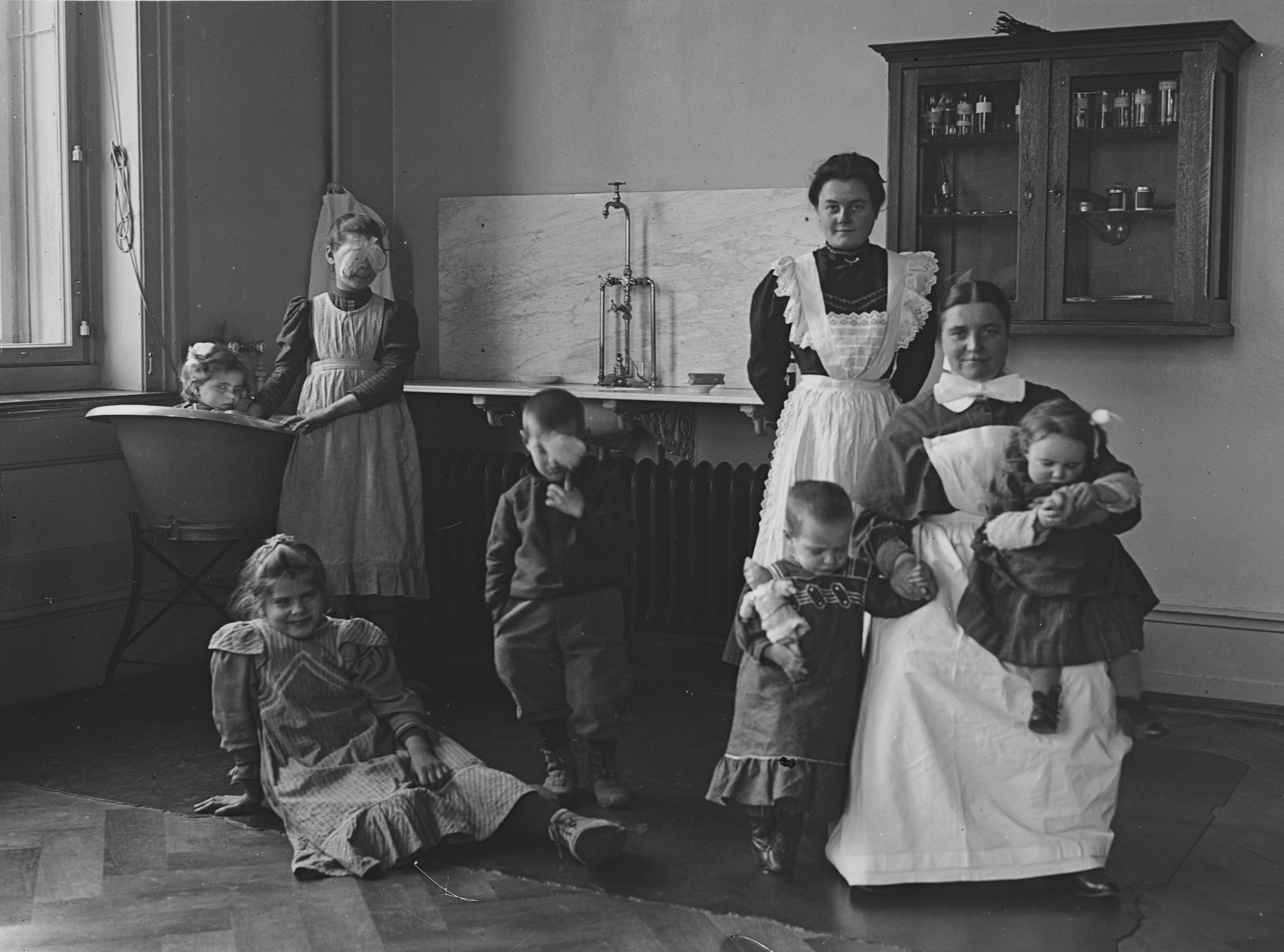 Krankenschwestern mit kleinen Patienten. Foto 1909.