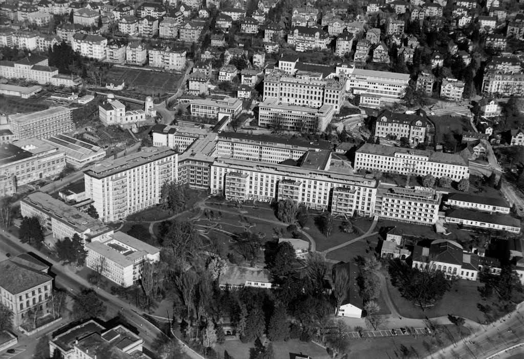 Nach längeren Diskussionen über eine grundlegende Modernisierung des Spitals wurde 1933/34 ein Ideenwettbewerb für einen Spitalneubau mit 1200 Betten beim Burghölzli ausgeschrieben. Durch die Verkürzung der Plattenstrasse und die Verlängerung der Gloriastrasse an die Rämistrasse schuf der Regierungsrat 1937 Raum für einen Spitalneubau am alten Standort in unmittelbarer Nähe zur Universität. Mit der Planung wurden die Preisträger des Ideenwettbewerbs beauftragt, die sich 1939 zur „Architektengemeinschaft für das Kantonsspital Zürich“ (AKZ) zusammenschlossen. Federführend waren Haefeli Moser Steiger (HMS: Max Ernst Haefeli, Werner M. Moser, Rudolf Steiger) und Hermann Fietz (1898-1977). Zur Organisation und architektonischen Bewältigung der vielfältigen Funktionen der Krankenversorgung, Lehre und Forschung eines modernen, effizienten Universitätsspitals gab es verschiedene, damals international diskutierte Konzepte (lineare oder kammartige Gebäudeanordnung, Block- oder Pavillonbau) und Vorbilder, darunter das von Alvar Aalto 1929-33 errichtete Sanatorium in Paimio, das Sanatorium Zonnestraal in Hilversum (1926-28) oder das Söderspital in Stockholm (1937-44).