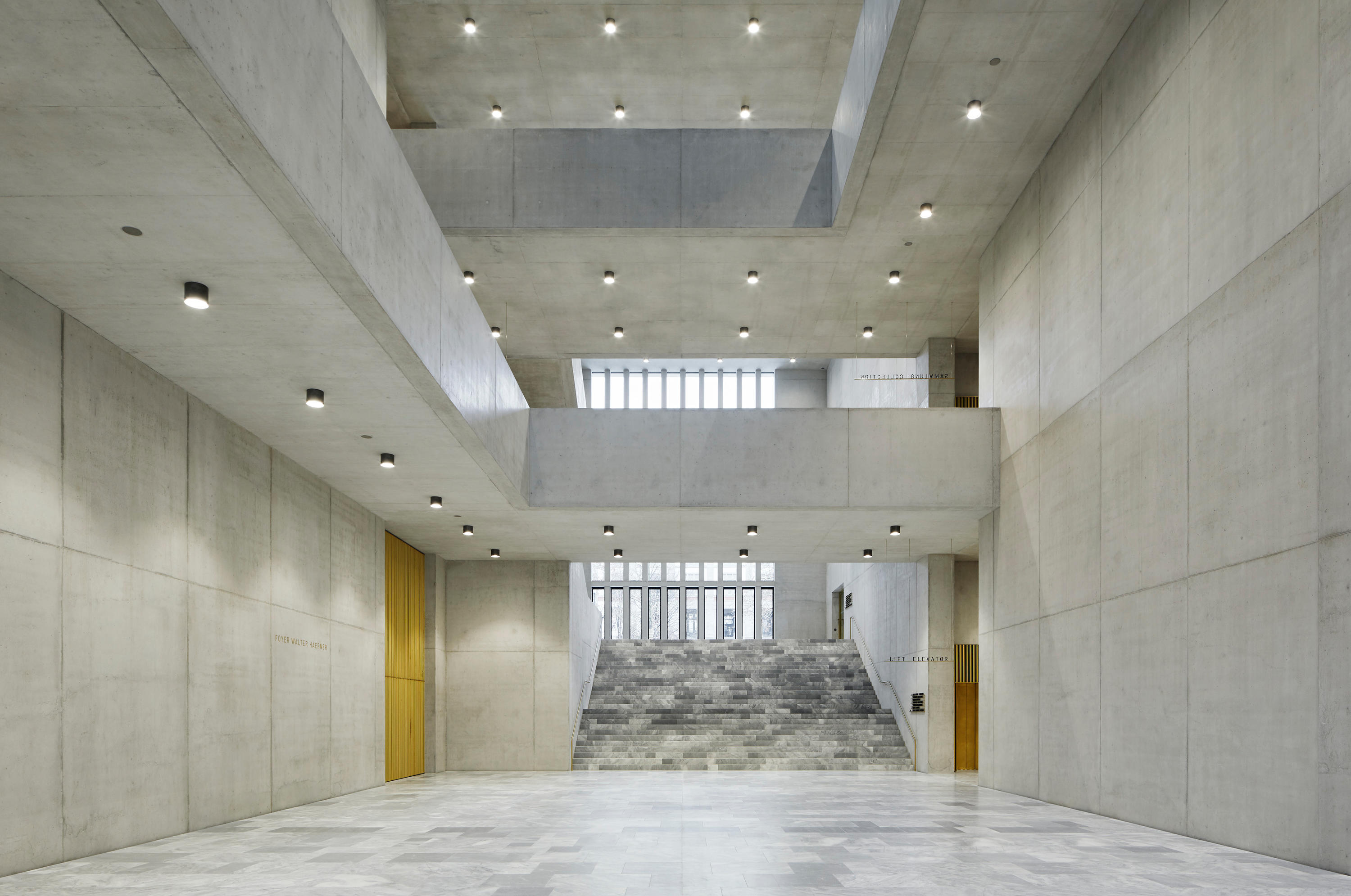 Die lichthofartige Halle mit Treppen und Galerien nimmt das Motiv des Lichthofs und der Halle der beiden anderen Bauten auf und variiert sie. Die vom Kunstgarten hinabführende Treppe in der Eingangshalle spielt mit dem Motiv der grossen Freitreppe vor der Alten Kantonschule.