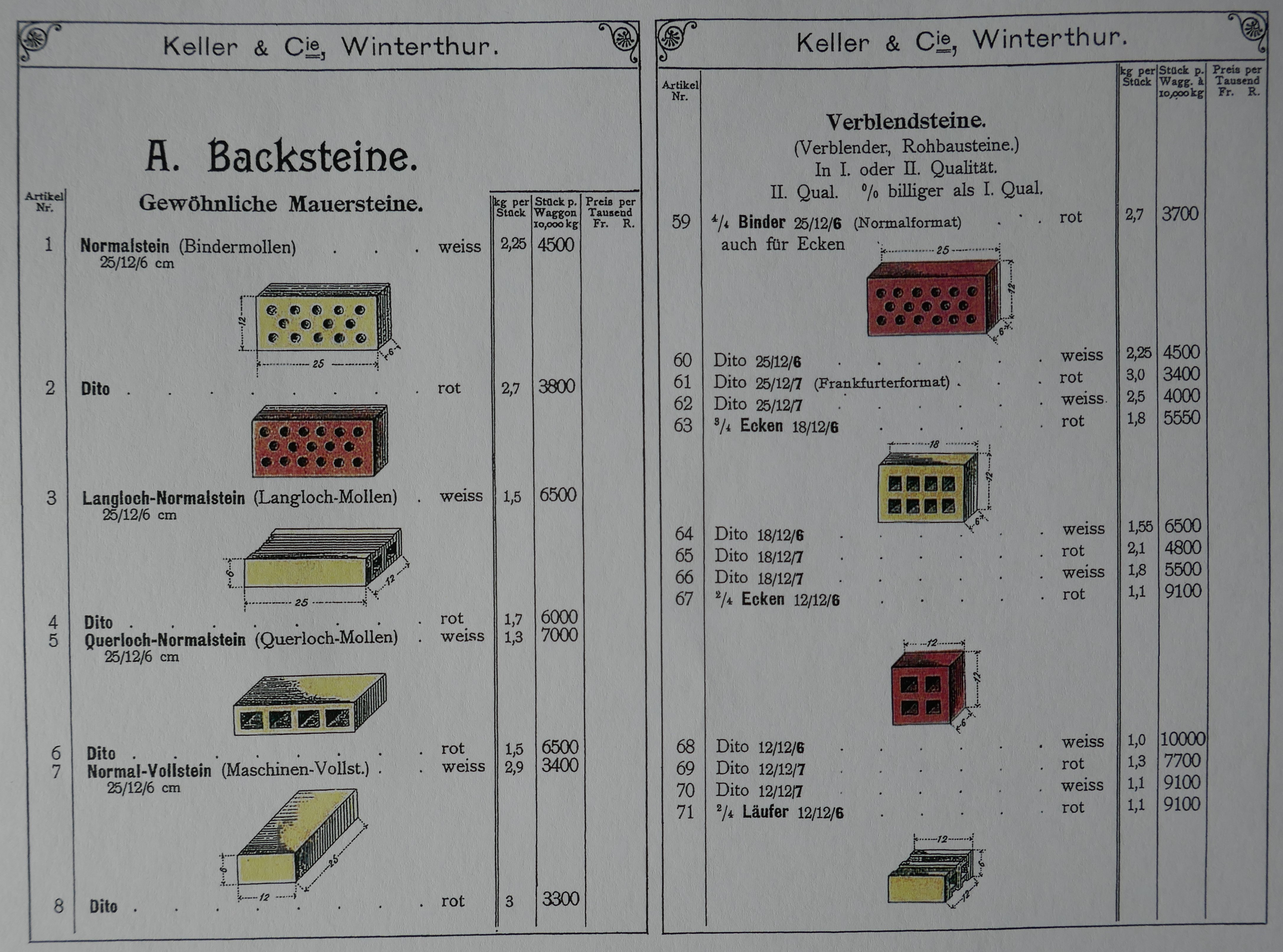 Hochgelochte, vollformatige Mauer- und Verblendziegel in einem Katalog der Keller Ziegeleien in Pfungen (S. 3 und 11) aus den Jahren um 1900.