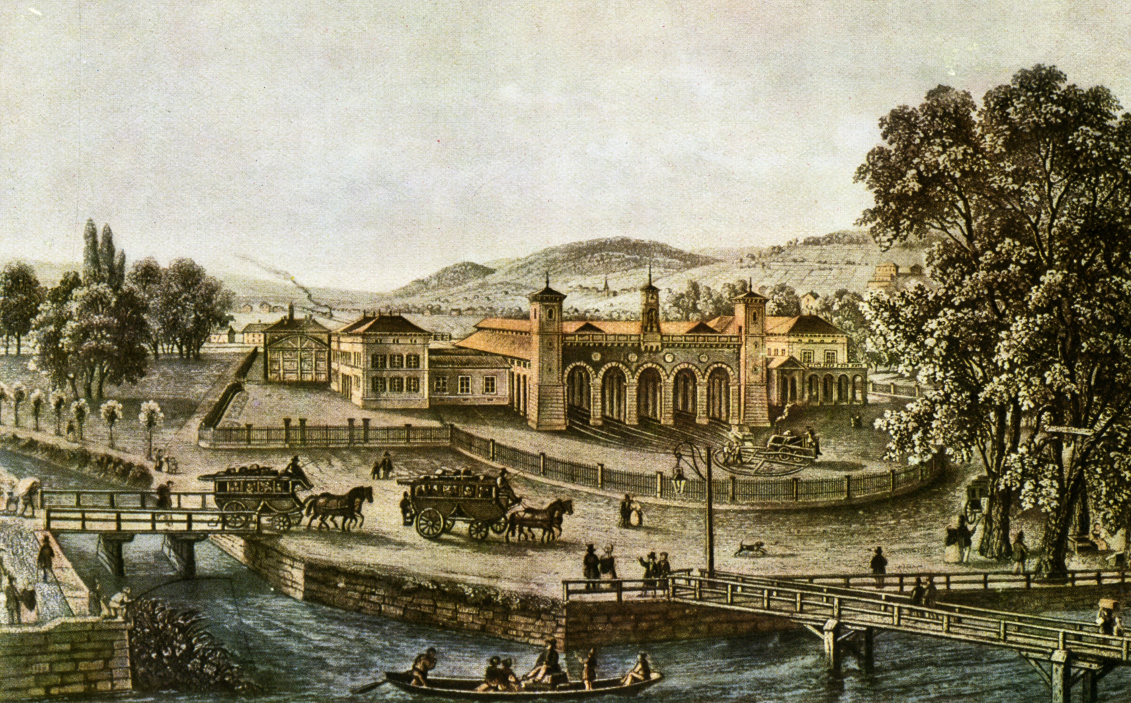 Wegmanns Nordbahn-Bahnhof (heute Hauptbahnhof) musste 1865 dem von Alfred Escher in Auftrag gegebenen Neubau Jakob Friedrich Wanners weichen. Lithografie eines unbekannten Künstlers, um 1847.