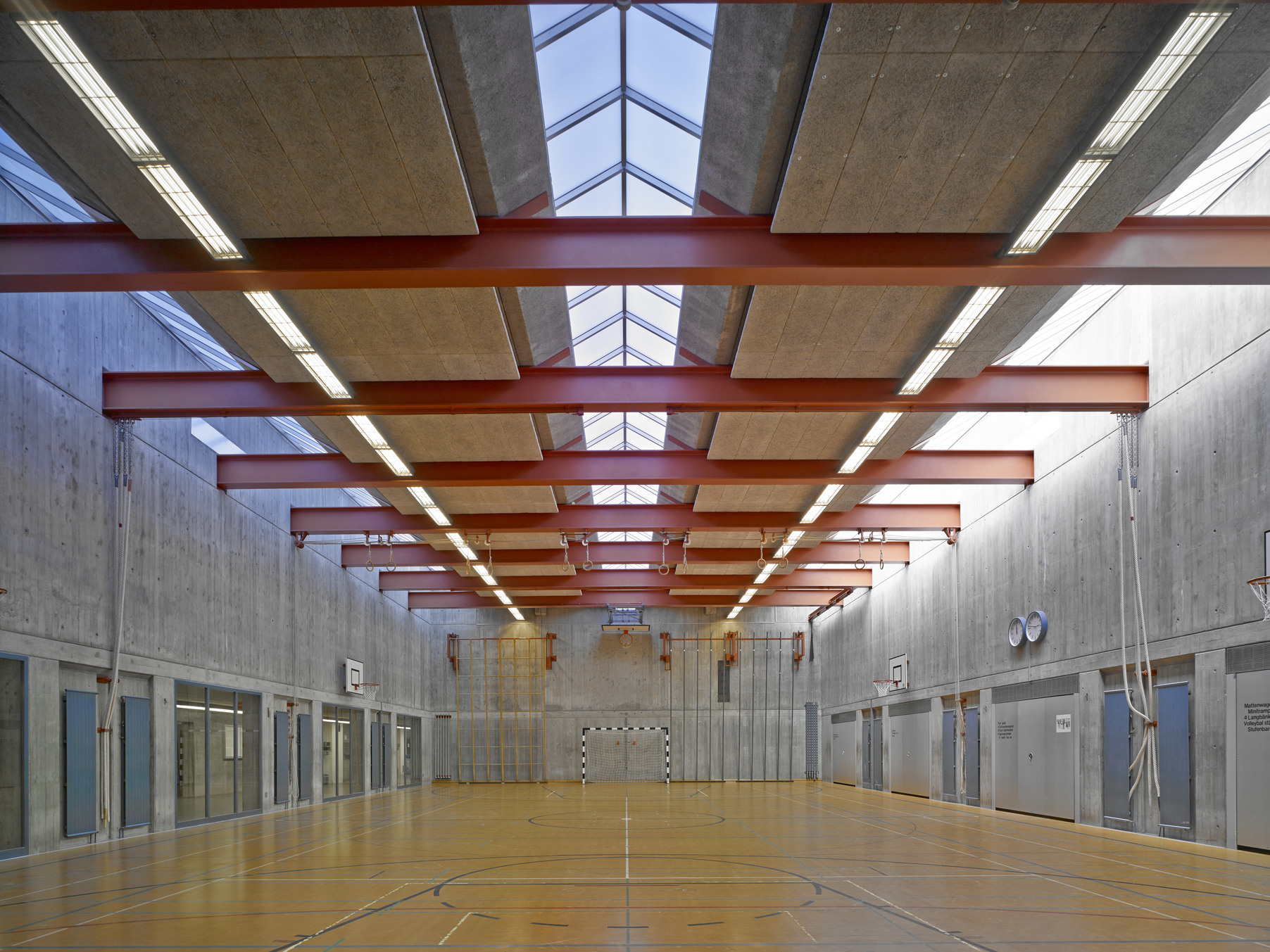 Von den drei aneinander gereihten Turnhallen lässt Eduard Neuenschwander nur die ungegliederten, im Sockelbereich der Längsseiten leicht geböschten Betonmauern der oberen Hallenhälfte mit den kappenartig aufgesetzten, Aluminium verkleideten Dreieckprofilen der Oberlichtbänder aus dem Boden ragen.