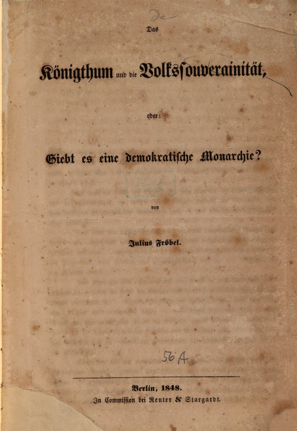Zum Tode verurteilt und begnadigt, wanderte Froebel nach Amerika aus, wo er bis 1857 lebte. Zurück in Deutschland, gründete er 1862 den grossdeutsch orientierten „Deutschen Reformverein“. Nach der Niederlage Wiens im österreichisch-preussischen Krieg unterstützte er in der von ihm seit 1867 herausgegebenen „Süddeutschen Presse“ die Einigungsbestrebungen Bismarcks. Mit der Gründung des Deutschen Reiches 1871 trat er unter anderem als Konsul in Smyrna und Algier in den Reichsdienst. 1888 zog er sich aus dem politischen Leben zurück und verbrachte die letzten Jahre in Zürich. O.C.