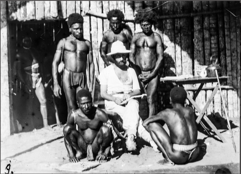 Otto Schlaginhaufen in Paup mit Eingeborenen während der Forschungsreise durch Deutsch-Guinea, 1909.