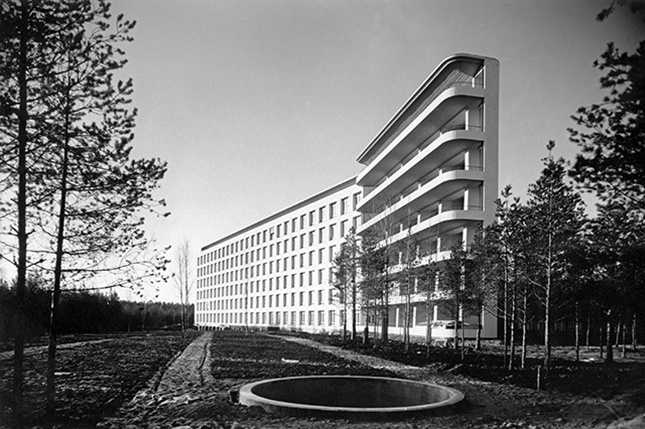 Abgewinkelte Front des der Sonne zugewandten, schmalen Betten- und Balkontrakts von Alvar Aaltos Sanatorium in Paimio. Foto um 1930.
