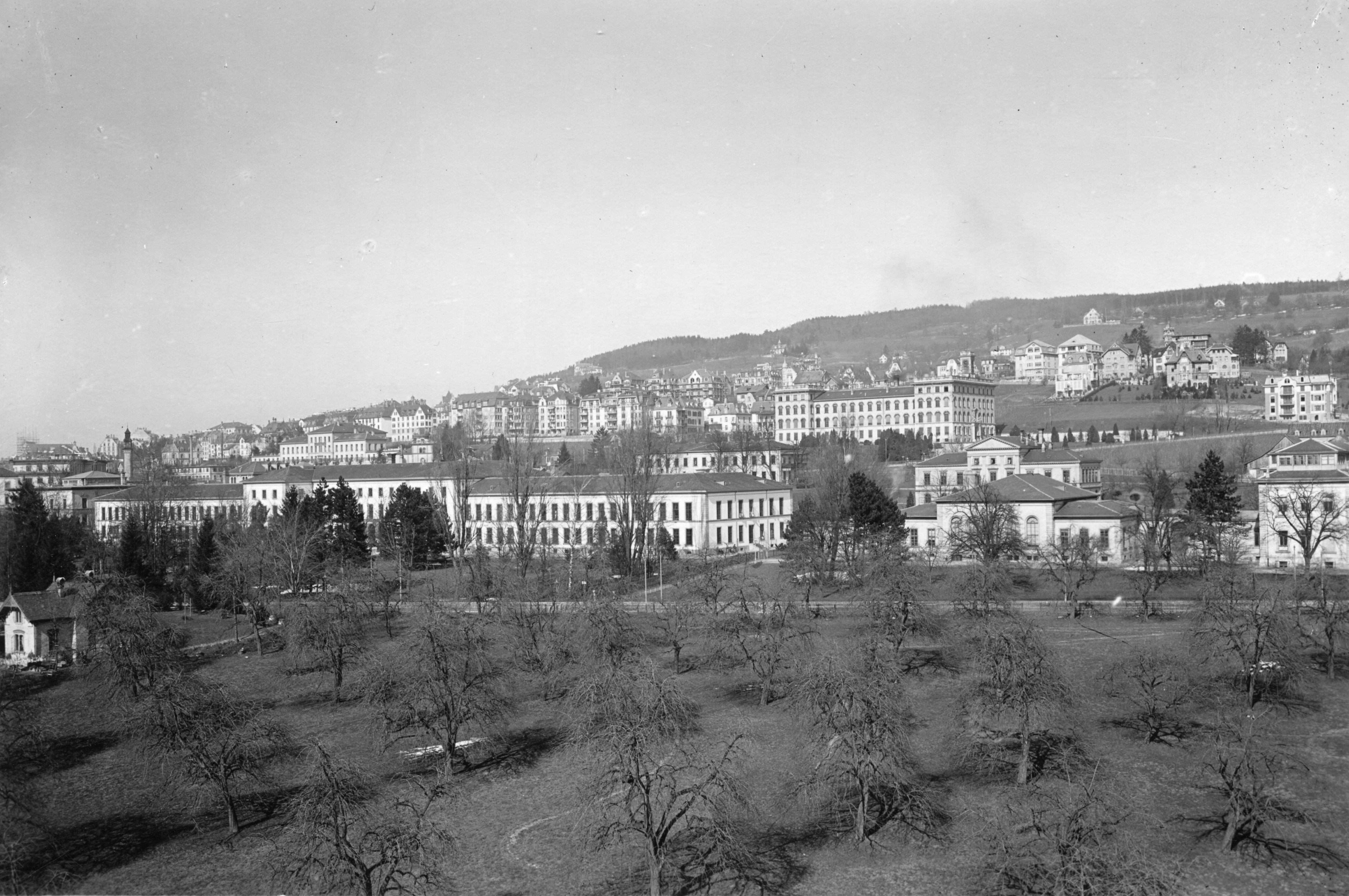 Im Vordergrund die Wässerwiese (heute Sportanlagen Rämistrasse 80) dahinter die lange Front des Kantonsspitals und das Anatomiegebäude. Foto um 1910.