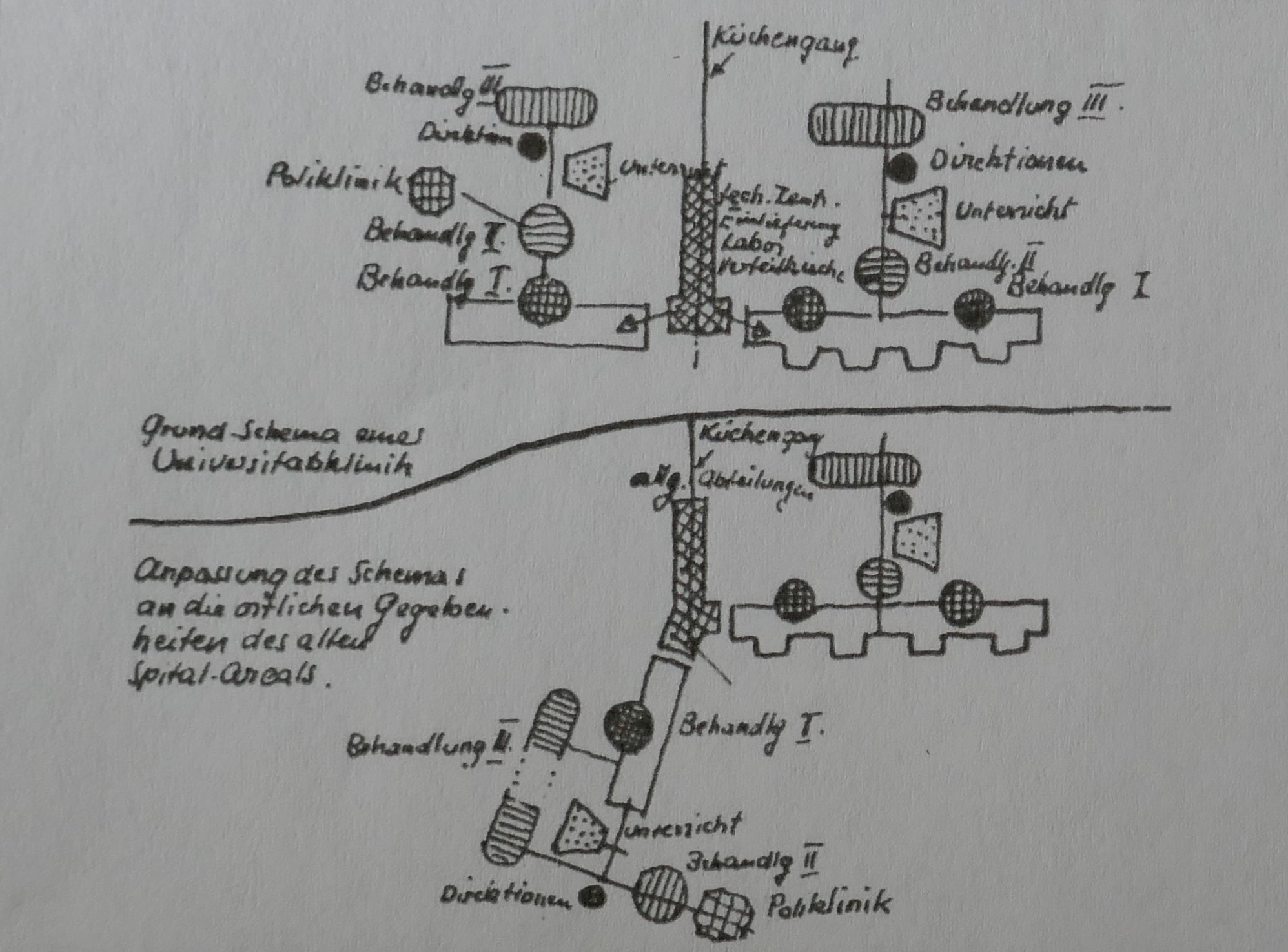 Hermann Fietz, Funktionsschema eines Spitals (oben) und dessen Anwendung auf die Situation in Zürich (unten). Die Adaption basiert auf der von Moser und Fietz während der Rückreise von Stockholm im März 1939 entwickelten Idee.